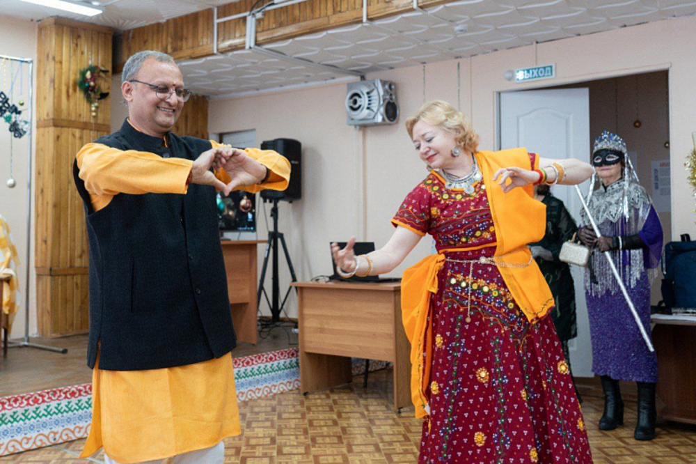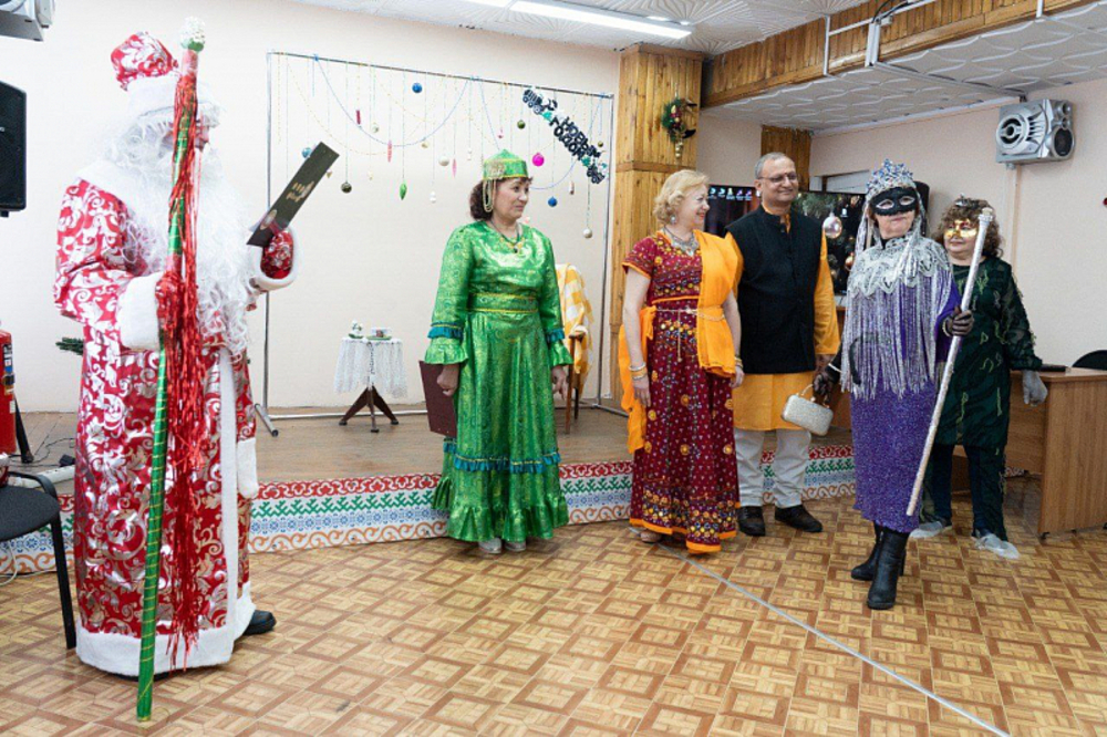 Представление проходило на татарском языке. Участники праздника – постоянные посетители комнаты татарского быта, а также студенты и гости из Индии. Они показали свой национальный танец, поздравив с наступающим Новым годом.