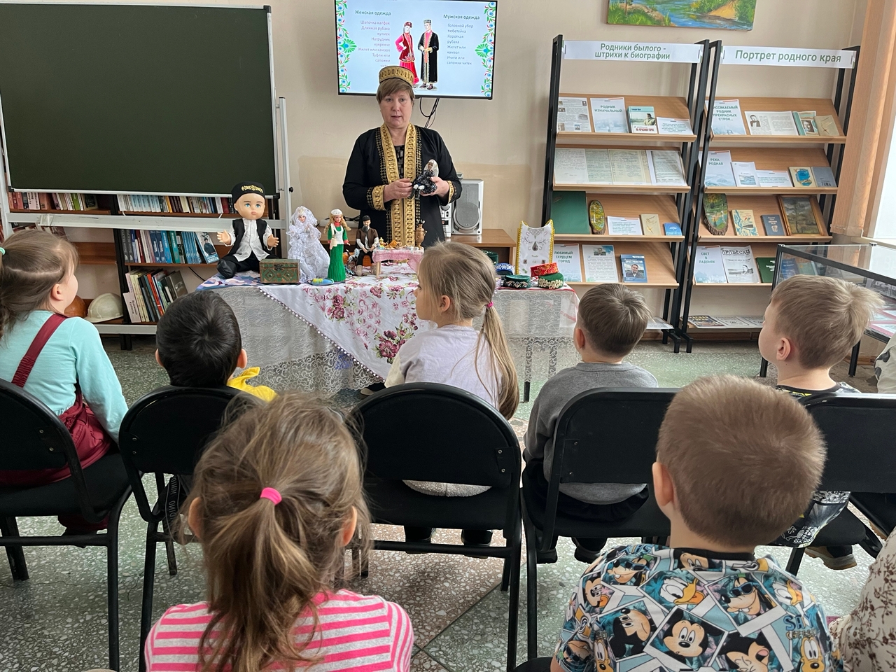 Ребята узнали много нового и интересного о традициях, культуре и повседневной жизни татарского народа благодаря увлекательным рассказам руководителя Алии Рашитовны. Она поделилась секретами, как одевались дети и взрослые, пояснила, что слово «изю» обозначает специальную манишку, надеваемую как под нарядный сарафан, так и сверху, а вовсе не изюм. Особое восхищение вызвали беседы о красивых женских головных уборах и их значениях.